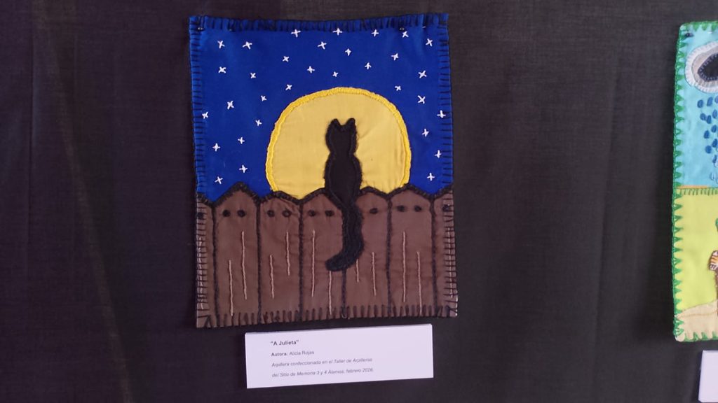 Silvia también explica que “al llamado para este taller se abren 15 cupos a la comunidad, que son rápidamente cubiertos por mujeres con diferentes experiencias, con las que logramos conformar un grupo humano con una sensibilidad especial en materia de Derechos Humanos. El taller se realizó en cuatro sesiones, con una sesión presencial semanal, pero con mucho trabajo en la casa. Este grupo se comprometió a terminar sus arpilleras en estas cuatro semanas para generar una pequeña pero bellísima exposición”.
